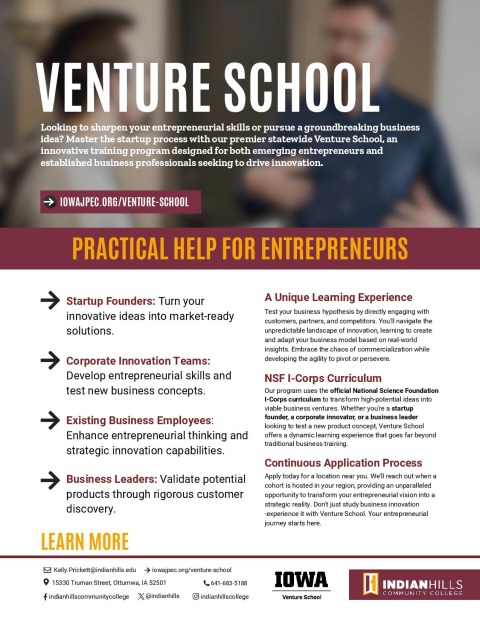 February 26, 2026 Venture School is a hands-on startup program for aspiring entrepreneurs and business owners ready to test and grow an idea. Participants join a local cohort, compete in a pitch competition, access John Pappajohn Entrepreneurial Center resources, and receive registration to EntreFest in June. Local support provided by IHCC’s Regional Entrepreneurship Center and the Iowa SBDC. Space limited, apply today at iowajpec.org/venture-school. For More Information