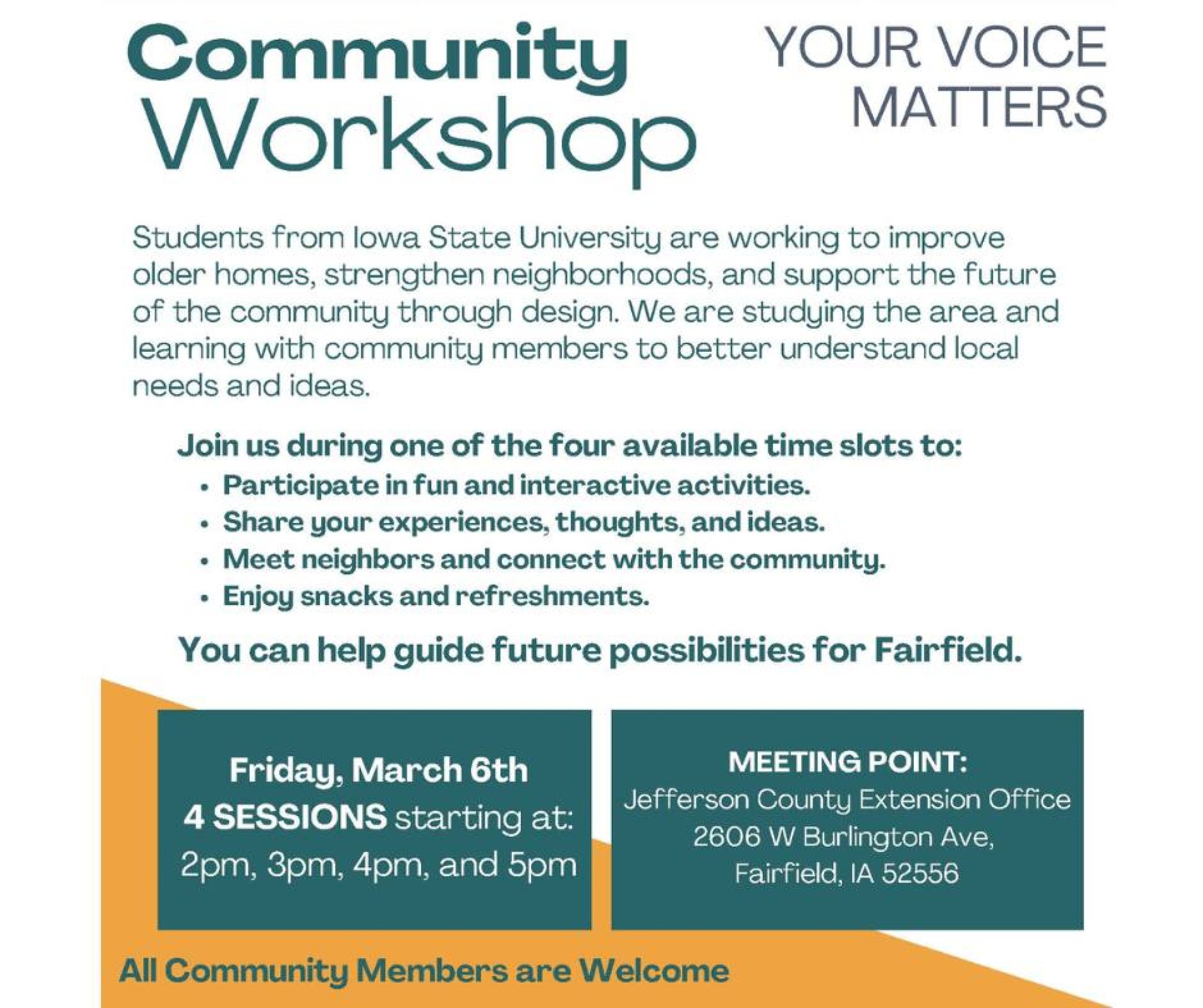 Students and faculty from the College of Design at Iowa State University are working with the Fairfield community to explore ideas for improving neighborhoods, housing, and the overall living environment. All community members are invited to participate in an upcoming workshop to share their experiences, perspectives, and ideas.